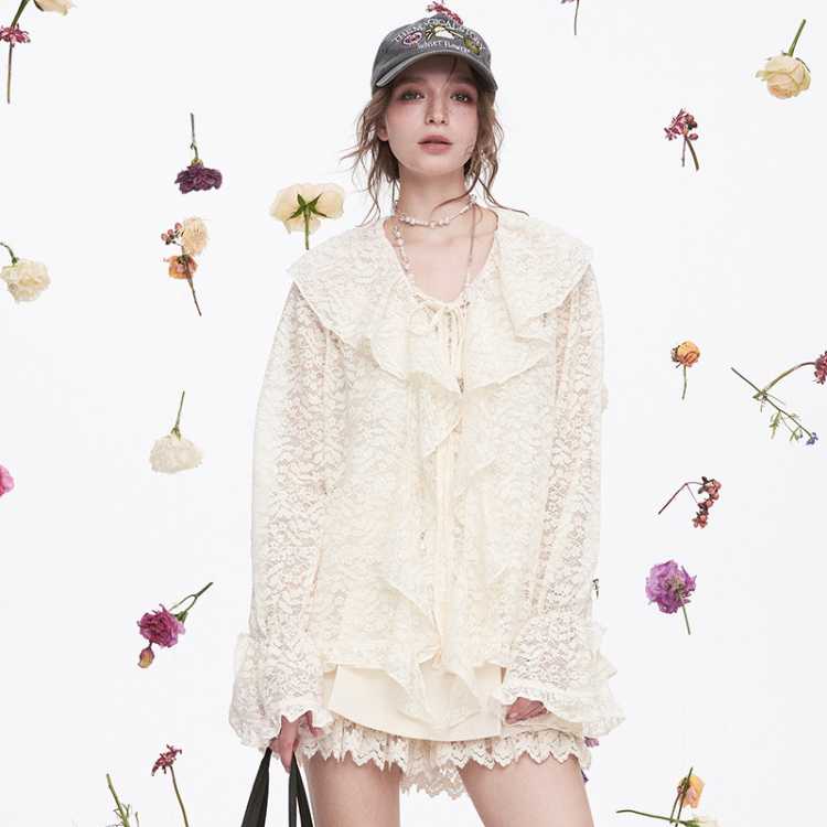 妖精的口袋 春季款设计感气质长袖小衫荷叶边法式蕾丝衫女