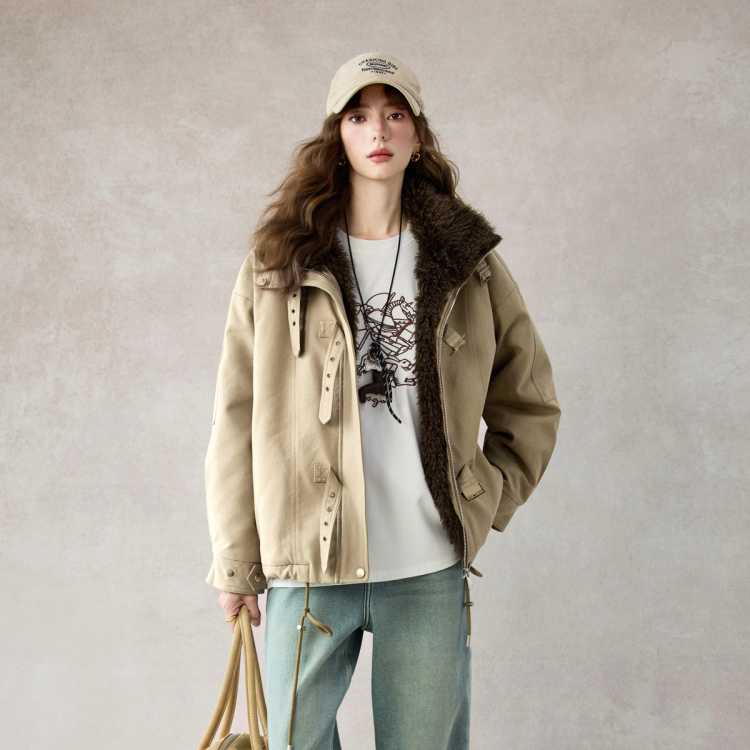 南瓜谷 【摩登旅人】蓬松绵密绒毛 春秋时尚工装短外套女机车风夹克