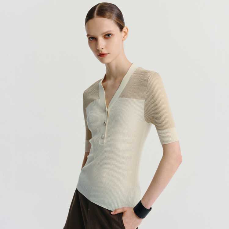 Havva 微透短袖V领针织衫正肩弹力舒适透气女士半袖T恤2026春夏