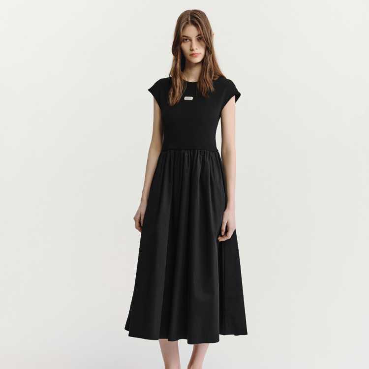 Havva 圆领短袖拼接连衣裙精致腰部褶皱显瘦女士中长款连衣裙2026年春夏