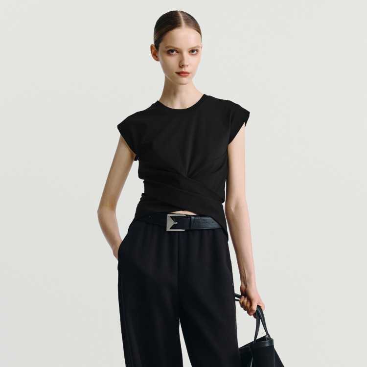 Havva 设计感褶皱扭结飞飞袖T恤短款不规则下摆女士上衣2026年春夏