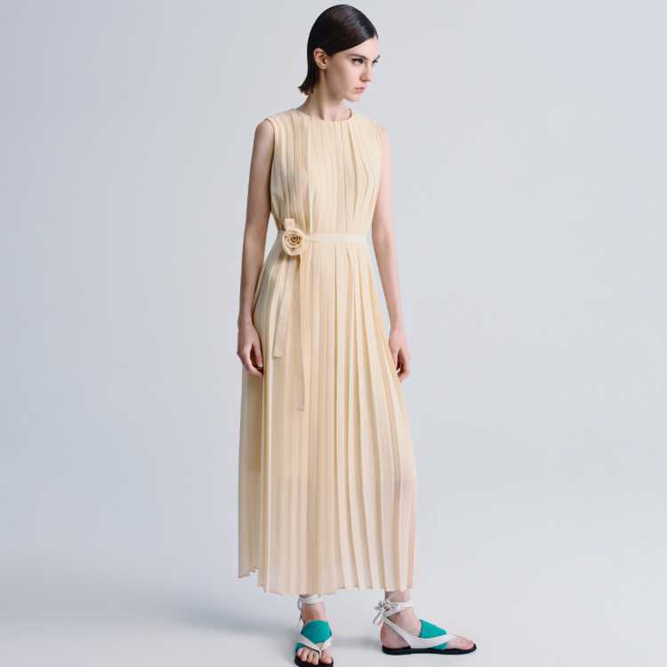 Havva 法式圆领系带无袖百褶连衣裙女设计感可拆卸花长裙2026夏季