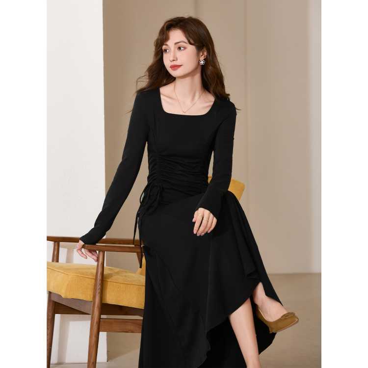 伊华欧秀 赫本风弹力修身针织黑裙女长袖春季时髦方领连衣裙内搭裙中长裙