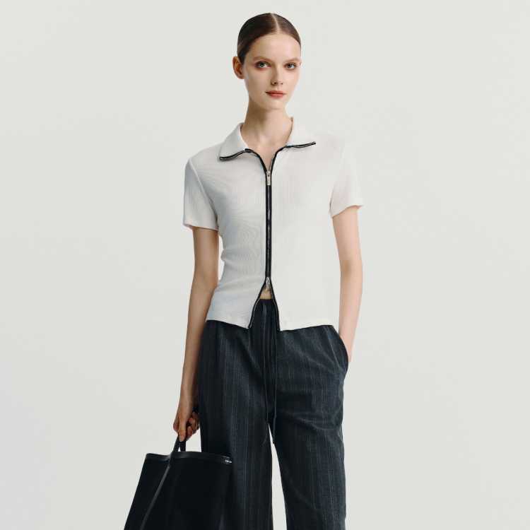 Havva 拉链半袖开衫短款正肩修身显瘦弹力针织质感女士上衣2026春夏