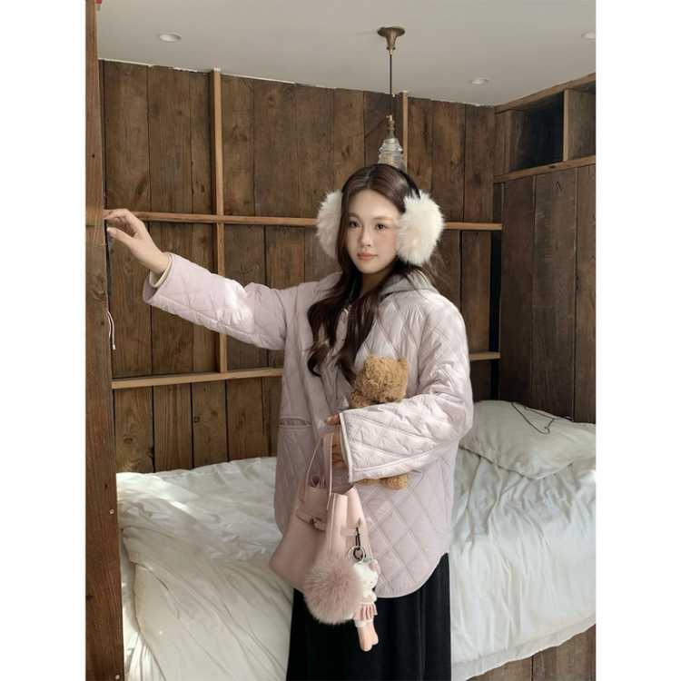 大婉酱 微胖大码女款时尚菱格夹棉外套宽松百搭显瘦轻薄棉衣