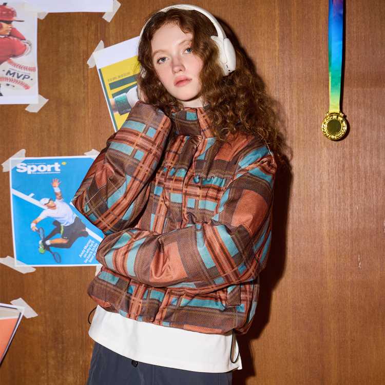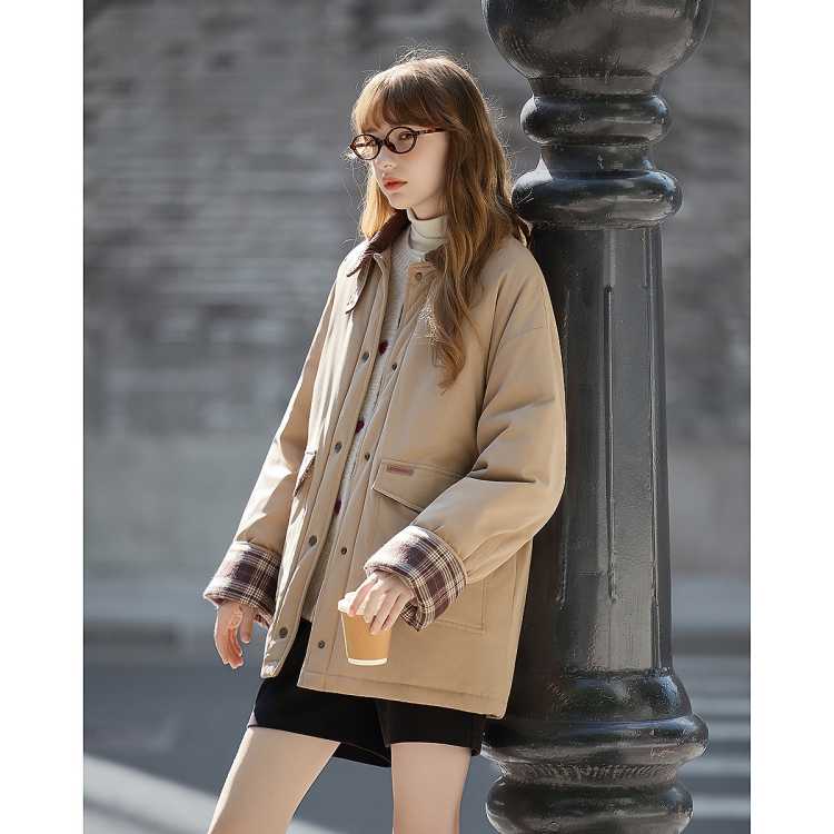 COOLHUT 美式复古格纹宽松短款女式棉衣冬季外套立领面包服