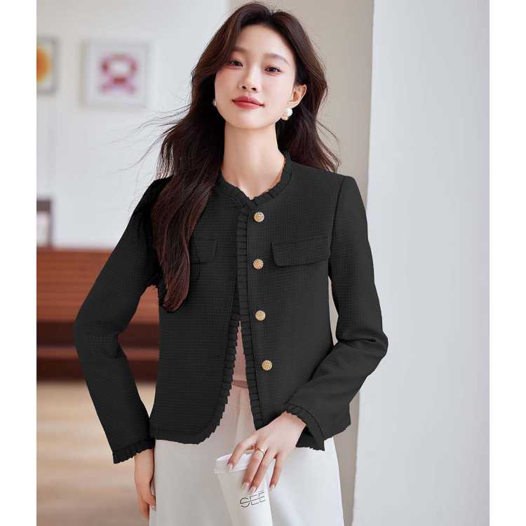 恒泽 【优雅轻奢】2025秋季圆领纯色拼接花边单排扣长袖外套女简洁