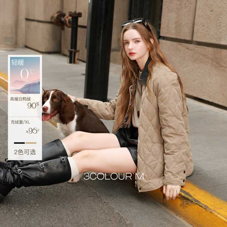 三彩 【2025冬季款】轻暖羽绒服拼接翻领90白鸭绒外套中长M