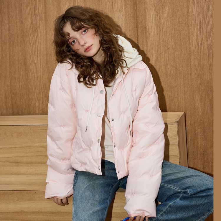 COOLHUT 粉色小清新蝴蝶结刺绣翻领轻薄甜美2025冬季女式棉衣