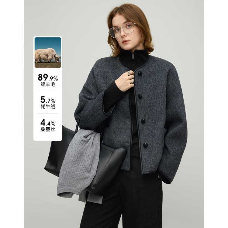 恒泽 25秋冬新款双面呢羊毛大衣女单排扣短款圆领时尚通勤毛呢外套