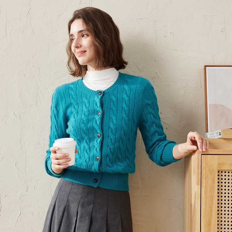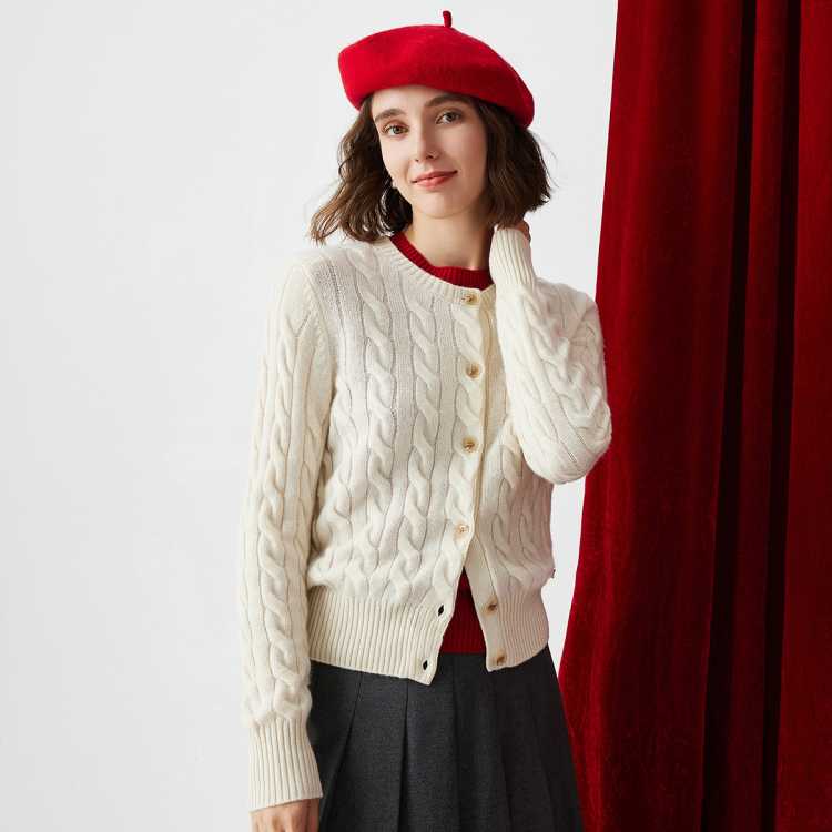 科蒙 叠穿100%山羊绒女美拉德开衫秋冬复古绞花短外套