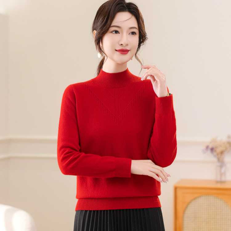 恒源祥 婚庆红品【100%绵羊毛】气质服贴半高领女式保暖羊毛衫针织套头衫