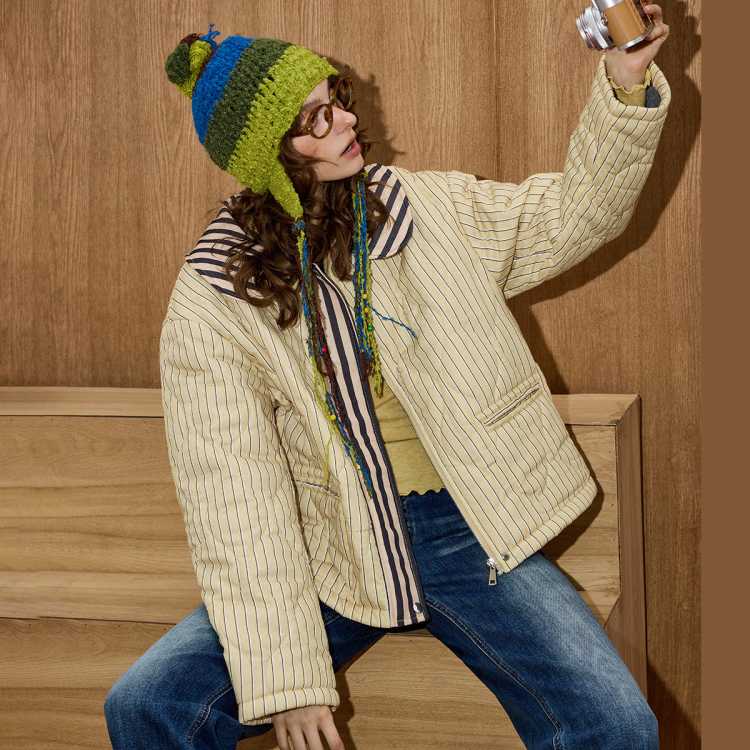 COOLHUT 美式复古慵懒感条纹拼接绗棉宽松2025冬季女式棉衣外套