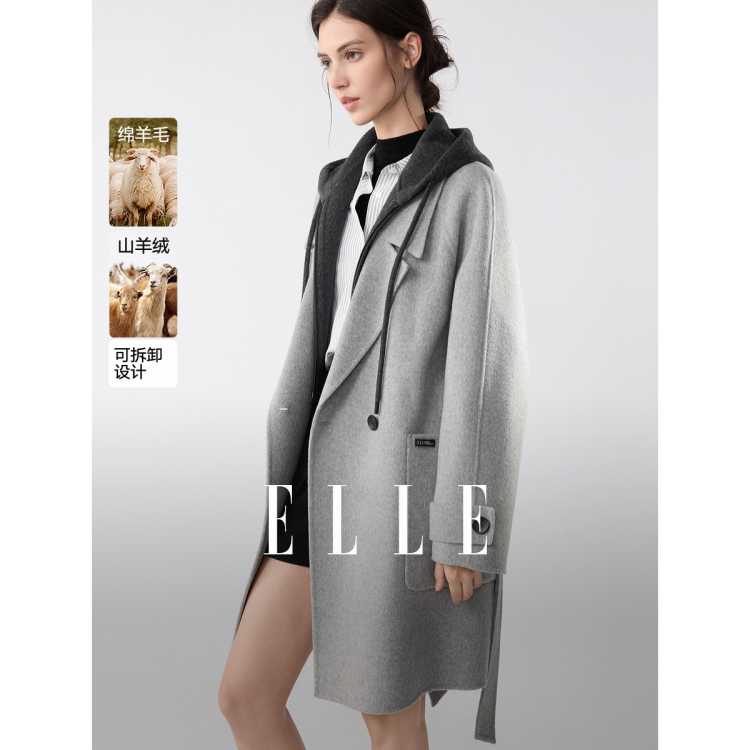 ELLE 【含山羊绒】假两件双面呢大衣女2025年冬季新款连帽毛呢外套